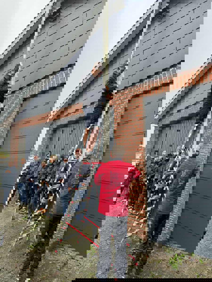 Formanden havde sørget for vejrgudernes velvilje, og der var tørvejr det kvarter den udendørs ceromoni varede. Uro'er Noah strøg vores stander hvorefter vi afsang klubsangen og lige nåede indenfor i tørvejr.
